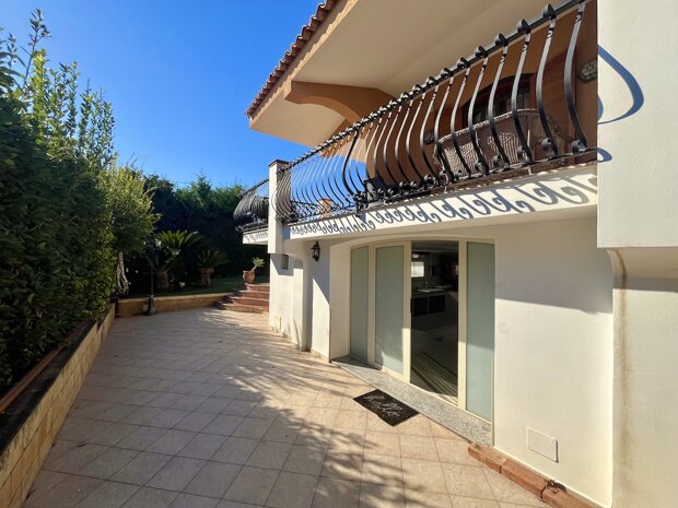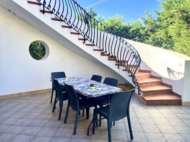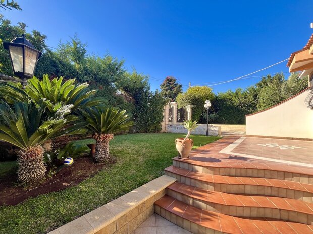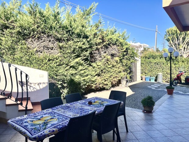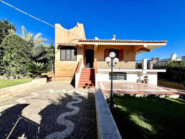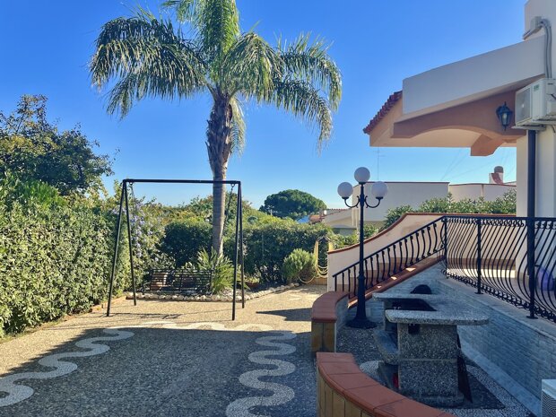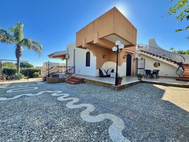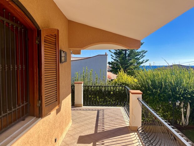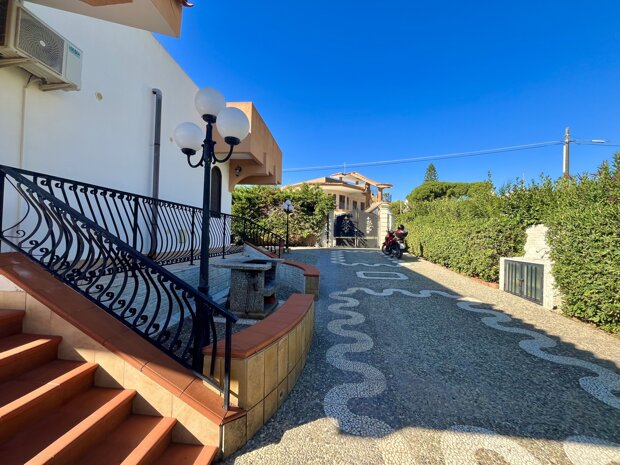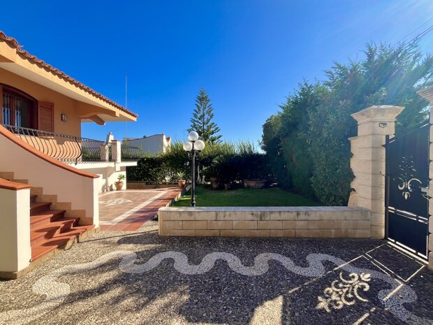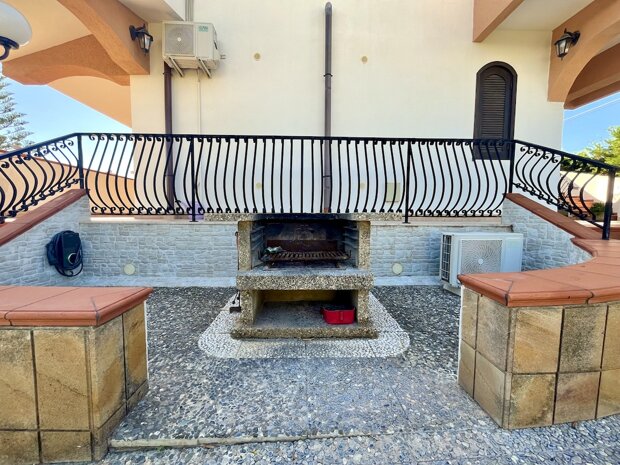 Esternamente l'immobile è ben curato e rifinito nei dettagli con pavimentazione a tappeto, scala che porta al terrazzo dove è possibile apprezzare una bellissima vista mare, verande e piccoli angoli di verde dove è possibile vivere l'esterno oltre a area barbecue e area giochi. Infine, l'ingresso alla villa è mediante 2 cancelli carrabili indipendenti. La villa è pronta da abitare immediatamente o da utilizzare a Casa vacanza o entrambe le possibilità visto i 2 appartamenti indipendenti.