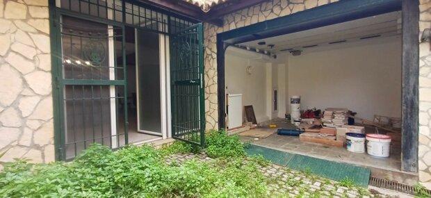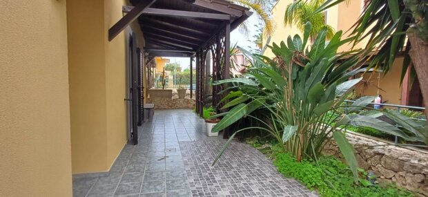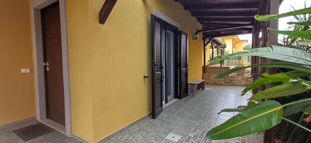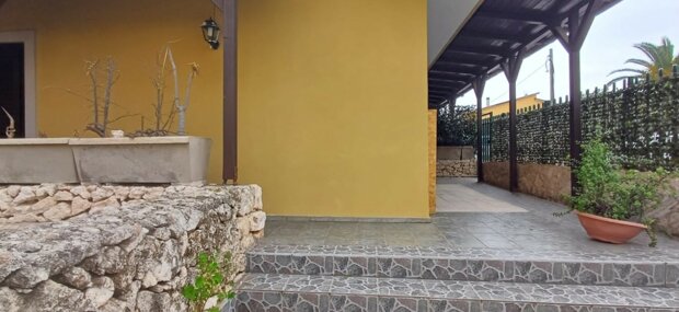 Esternamente l'immobile è composto da un ingresso mediante cancello grande e pedonale, garage e spazio esterno decorato con piante ornamentali, muretti in pietra a secco e 2 grandi verande coperte con tettoie caratteristiche in legno.
